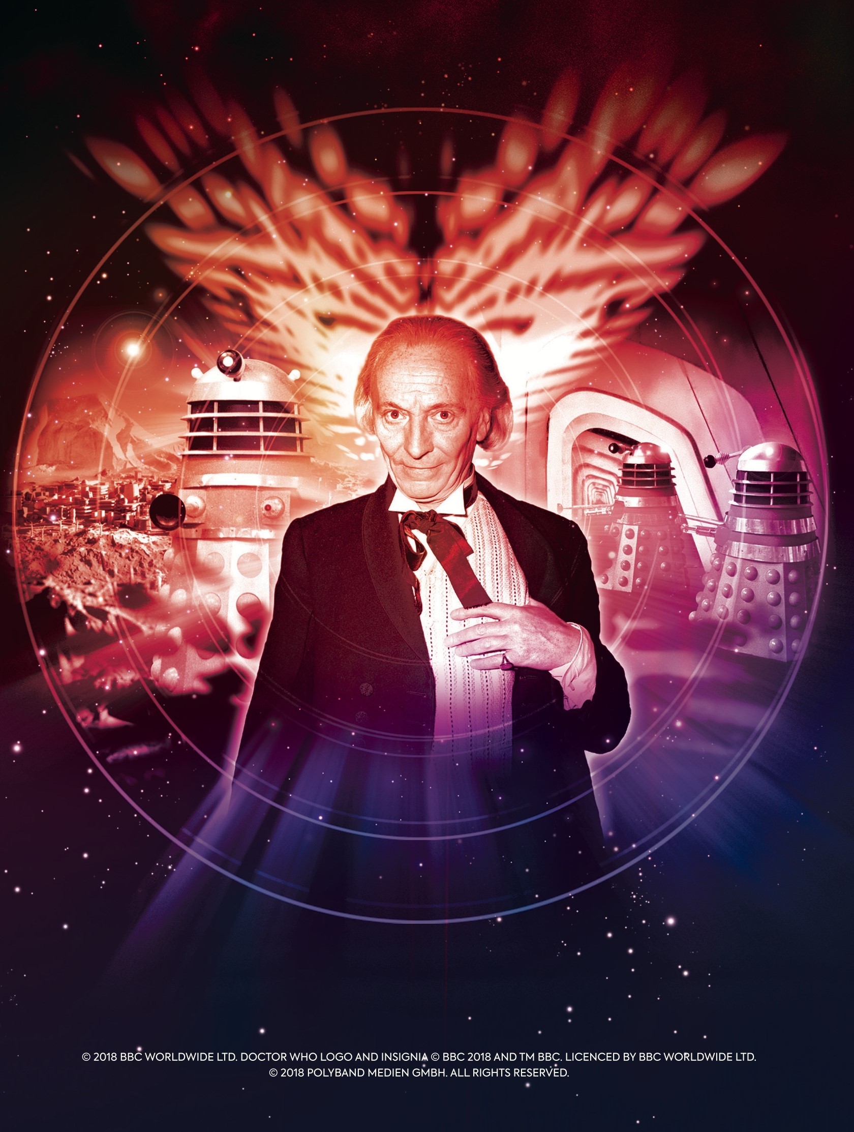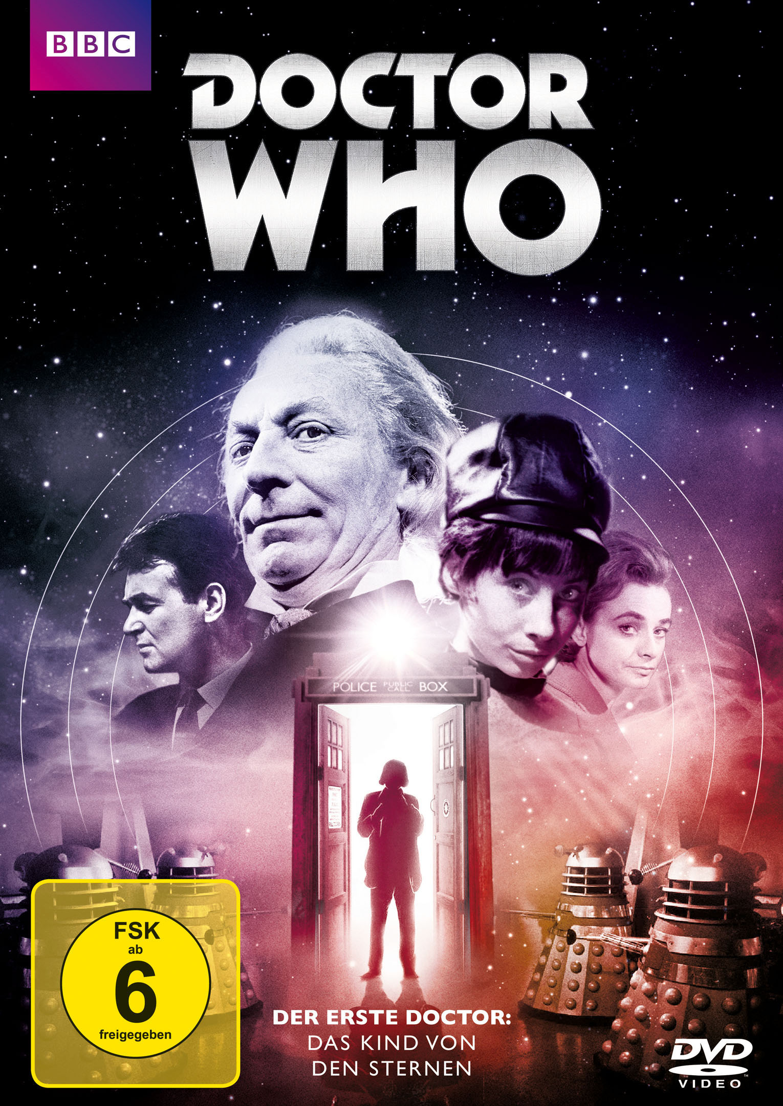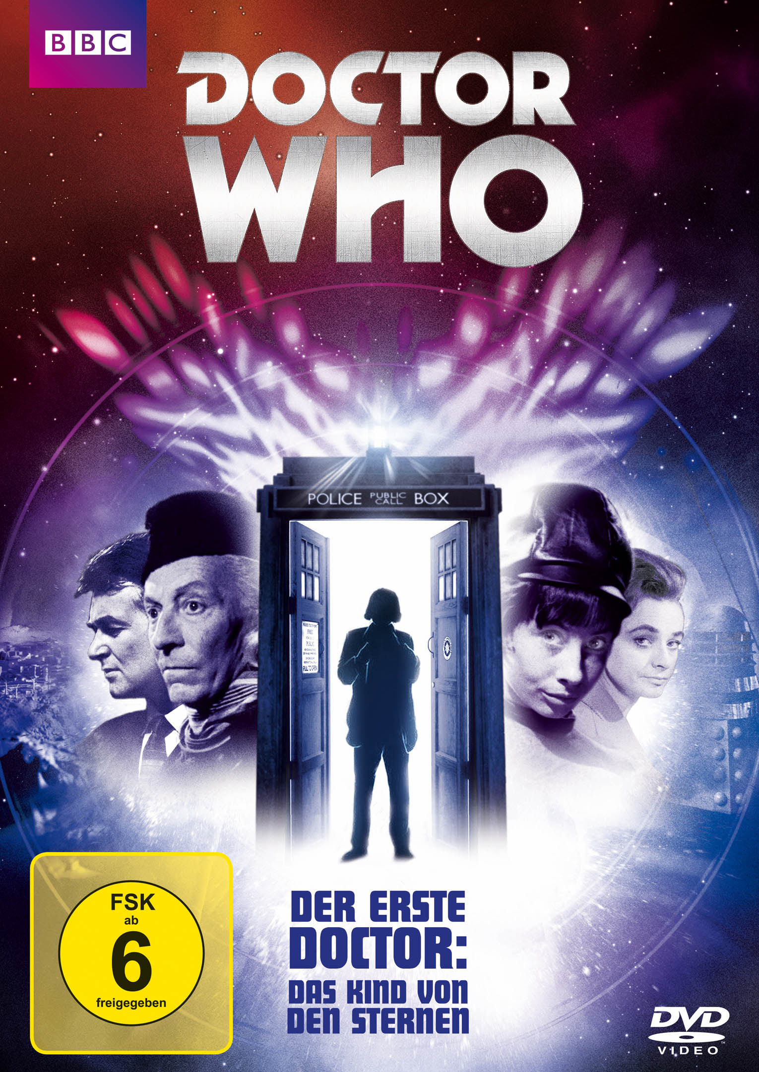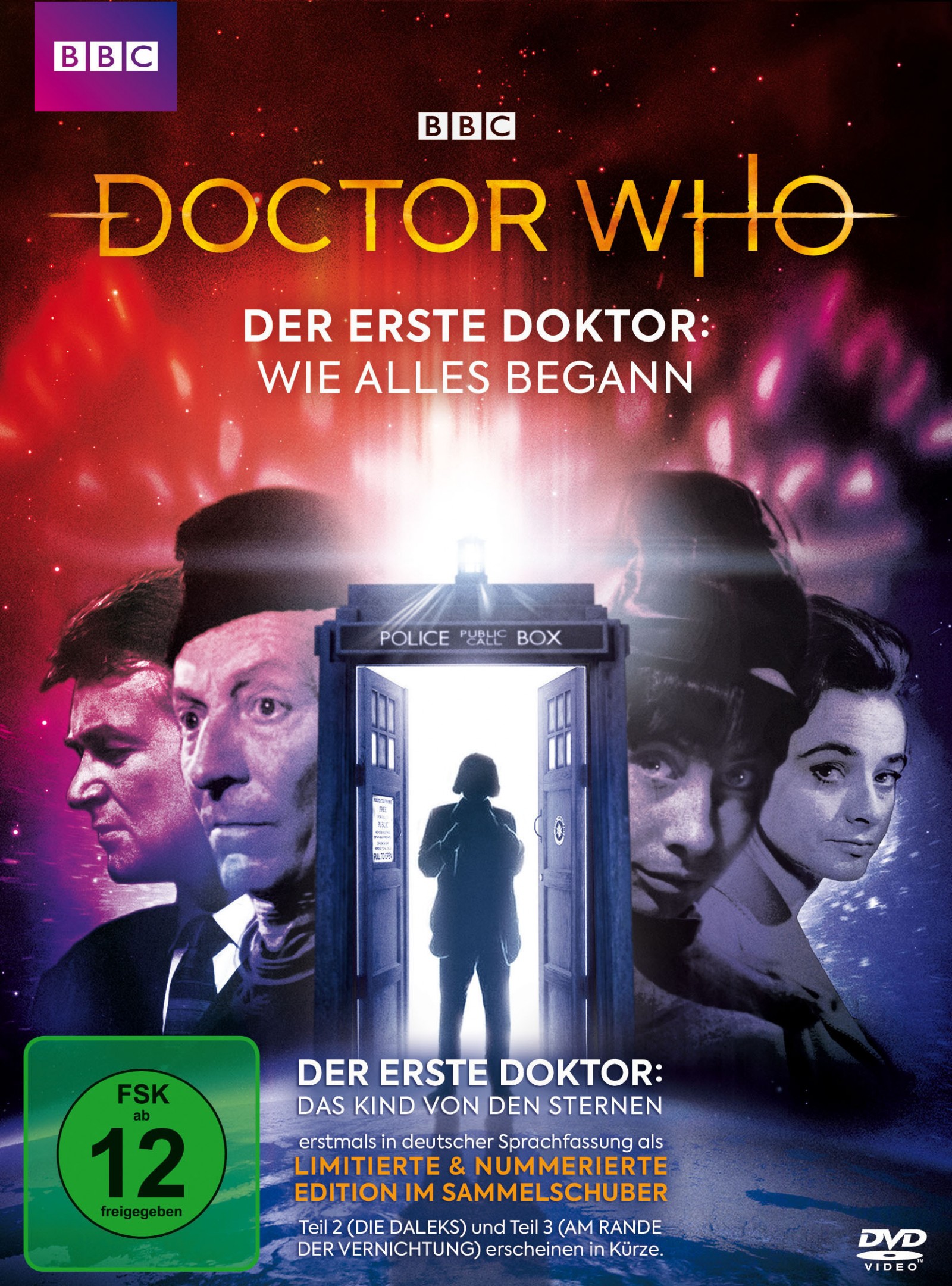 Blu-ray/DVD-Cover von Doctor Who: Der erste Doktor – Wie alles begann. Die Anfänge der legendären Serie mit William Hartnell als erster Doktor, erstmals in deutscher Synchronfassung. BBC-Edition mit FSK 12 Freigabe.