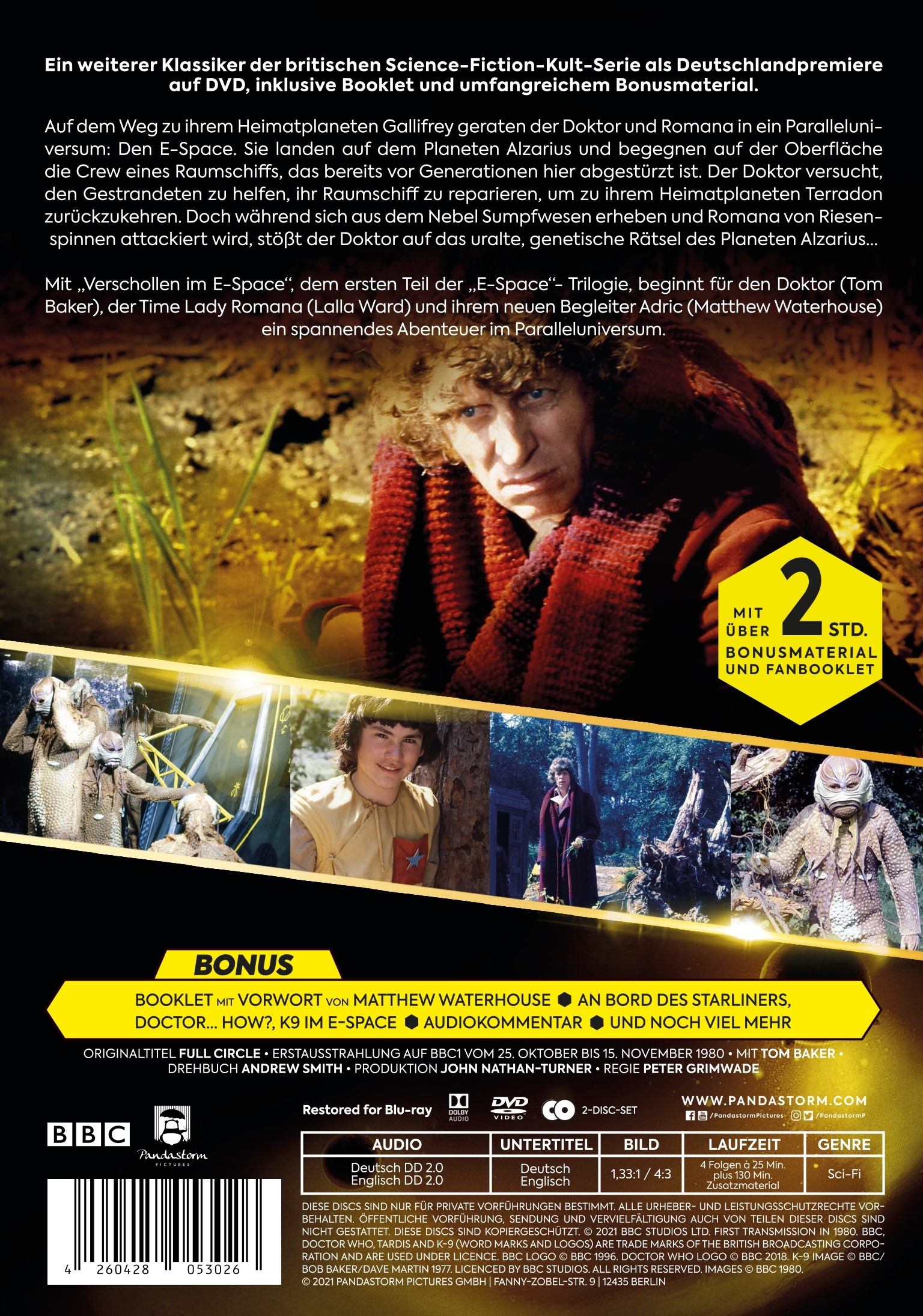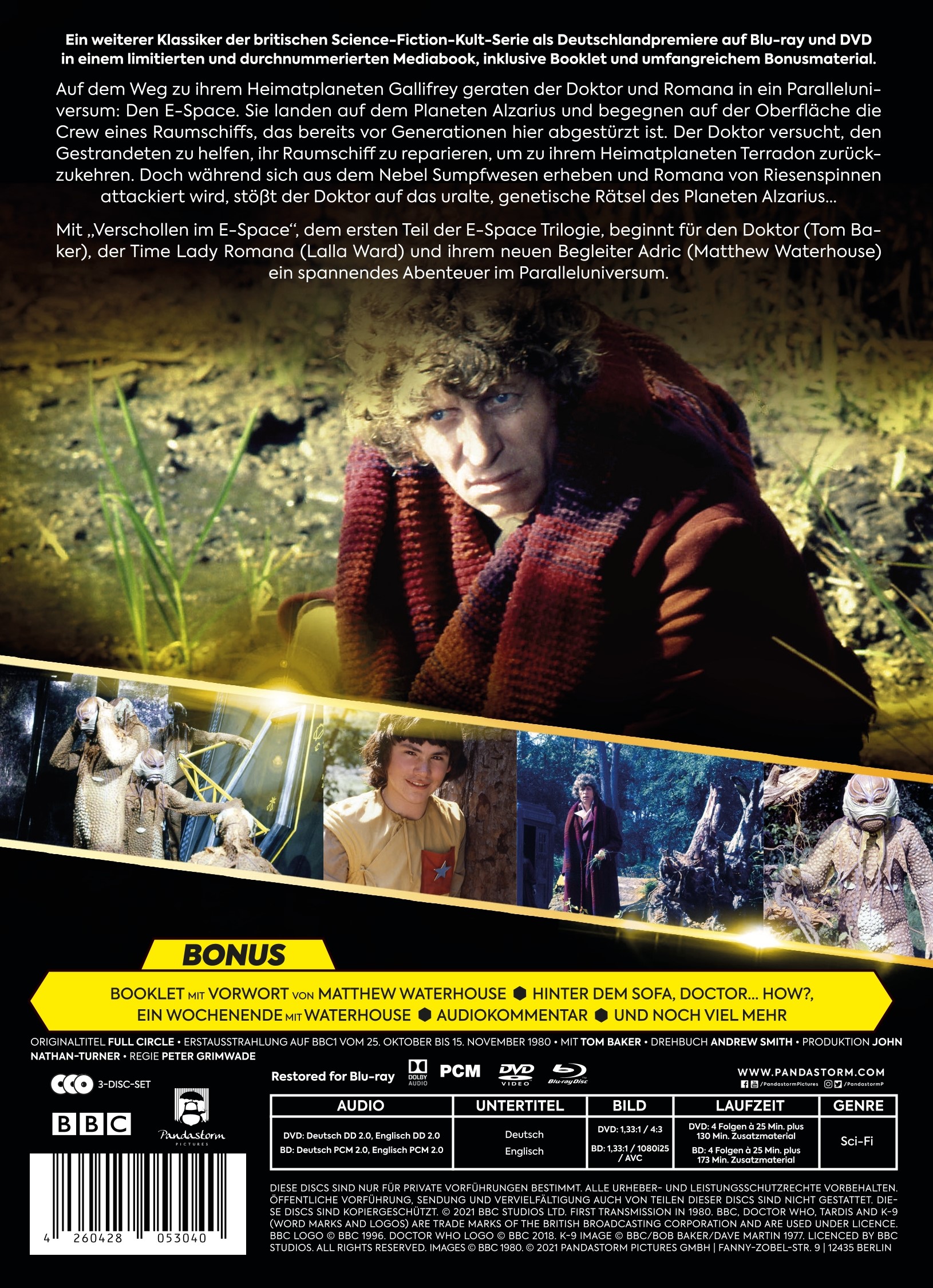 • Die erste Cover-Version von Verschollen im E-Space zeigte oben rechts eine rituell gekleidete Kultanhängerin aus The Stones of Blood, die fälschlich als Monster von Full Circle interpretiert wurde. Da die Figur nicht aus den enthaltenen Episoden stammt, wurde sie in späteren Ausgaben entfernt. Die Mediabook-Edition enthält sie noch.