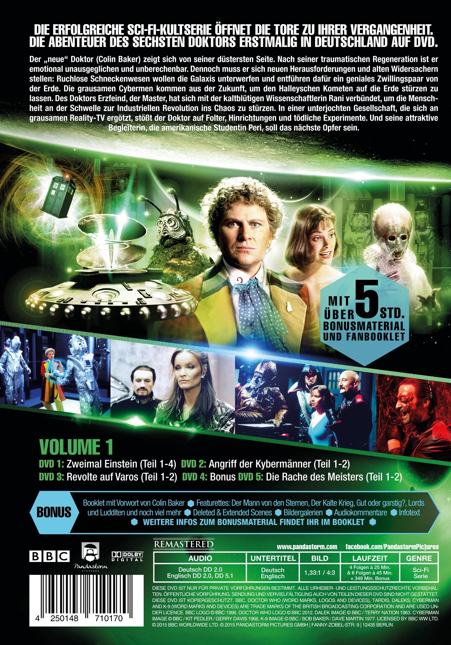 Doctor Who – Sechster Doktor Volume 1 (DVD). Das Cover zeigt den sechsten Doctor (Colin Baker) und einen klassischen Cyberman vor einem grünen, futuristischen Hintergrund. Veröffentlicht von der BBC, FSK 12 freigegeben.